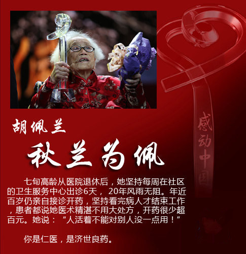 胡佩兰,女,98岁,解放军3519职工医院和郑州市建中街社区卫生服务中心坐诊医生。1944年,胡佩兰毕业于河南大学医学部,70岁时才从郑州铁路中心医院的妇产科主任位上退休。退休后,她一直坚持坐诊。胡佩兰生活节俭,舍不得在自己身上多花一分钱。但她经常大方地给病人垫付医药费。她还拿出微薄的坐诊收入和退休金,捐建了50多个“希望书屋”。胡佩兰患有严重的腰椎间盘突出,进出都要坐小推椅。2013年7月,98岁胡佩兰心脏病突发,经抢救后,第二天她依然准时到医院坐诊。胡佩兰根据自己多年的临床经验,平时看病不太依靠高科技仪器。因为慕名找上门的病人多,胡佩兰每天都会坚持看完所有病人才下班,对患者也极有耐心,给病人开药,很少超过一百元。
